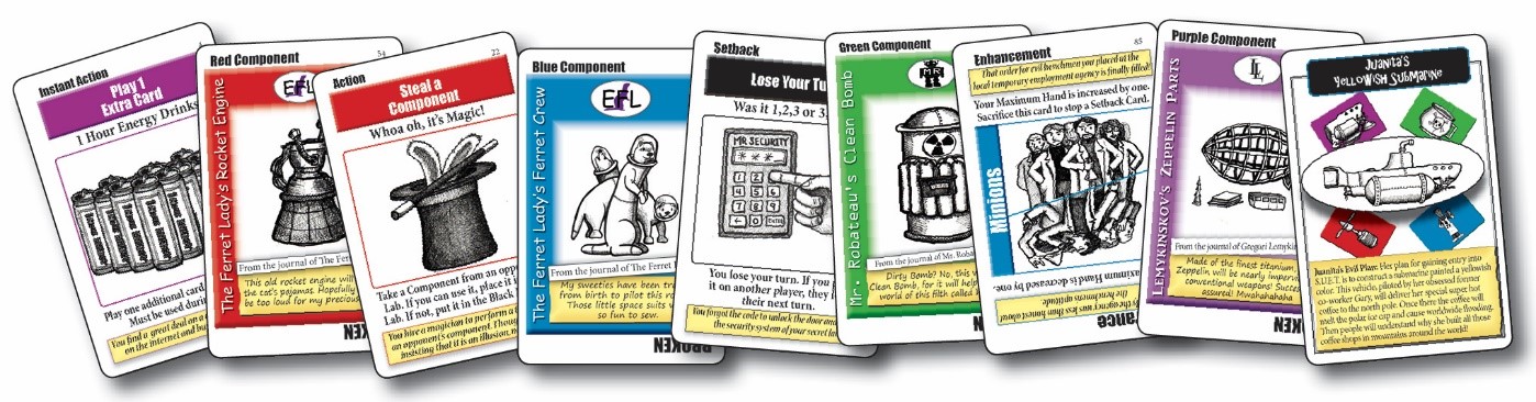 Since I know John — and more importantly, I know what his devious mind is capable of — I backed that sucker. I can’t wait to play it, and I think many of you out there would enjoy it as well. So I invited him here to tell you all about SUET and the Evil Genius Goodness it contains. You can also click on each image to get a better look at the art and cards.