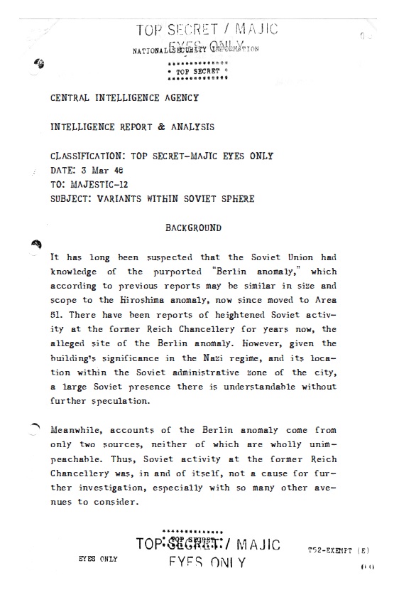 This is a document in the book — but Night Shade didn’t create it. It’s the “official” MAJESTIC-12 authorization memo from Harry S. Truman himself. I put “official” in quotes because, despite what certain corners of the Internet believe, the MAJESTIC-12 conspiracy theory remains as fictional as MJ-12: Inception, and this is widely considered to be fake. Anyway, here it is: